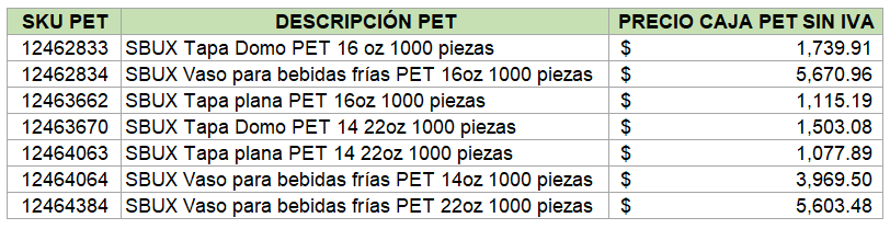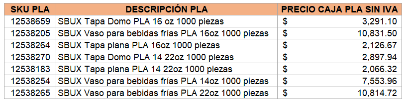 En este recuadro, les compartimos los precios actuales (PET) vs los nuevos precios que tendrán los compostables (PLA):