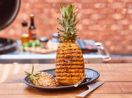 3Mezcla el azúcar con la canela y reserva. Asa la piña a fuego medio indirecto con la marinada por 1 hora a 175 °C girándola ocasionalmente. Retira del asador y cúbrela con el azúcar y canela, asa por 30 minutos a fuego medio indirecto más girándola ocasionalmente. Retira del asador y ofrece.