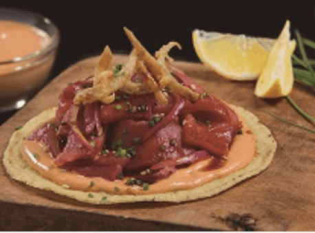 3Unta un poco de la crema de chipotle en las tostadas, agrega las láminas de Atún Dolores® Premium, cebolla morada preparada y por último decora con las cebollas crujientes.